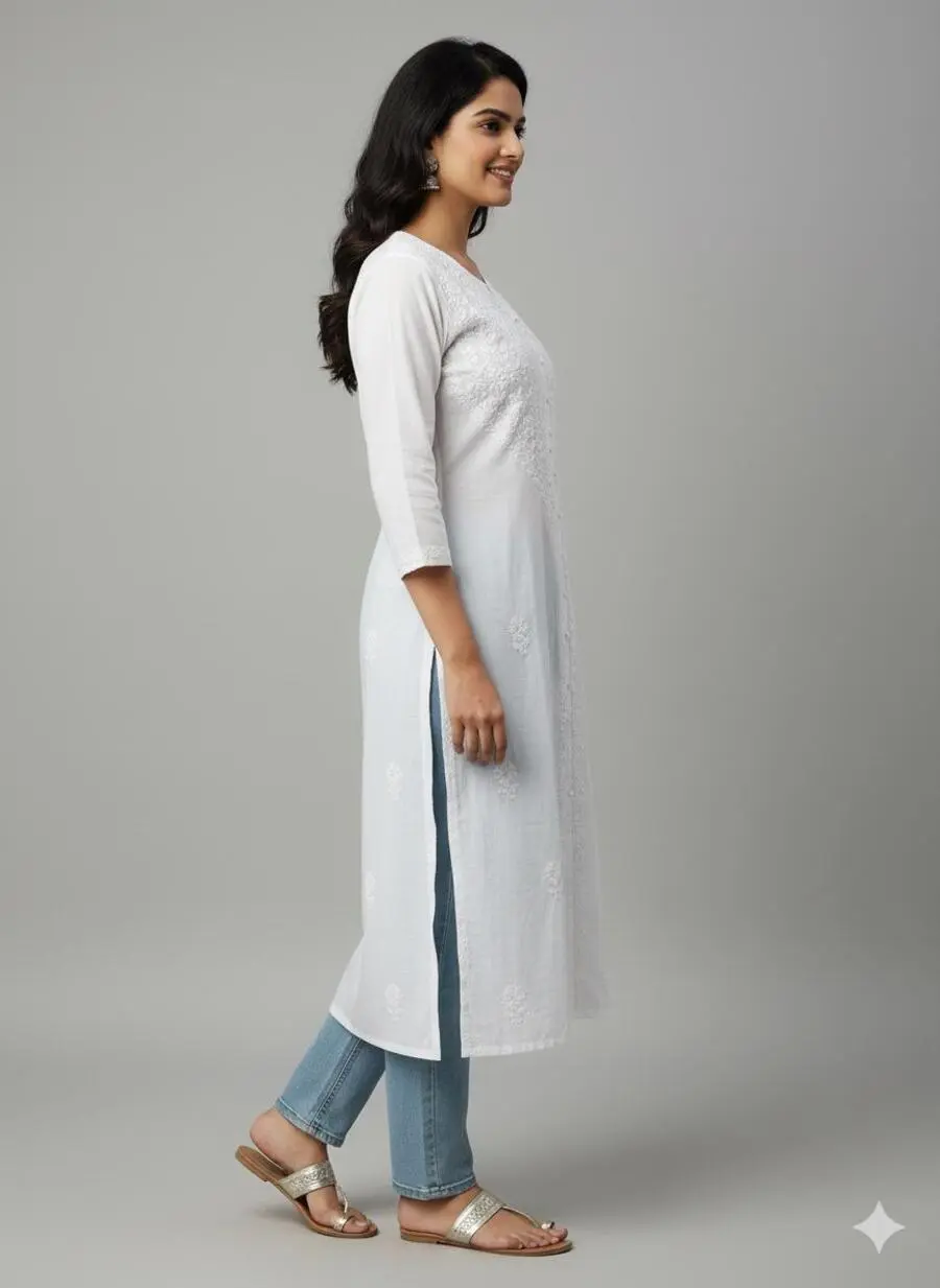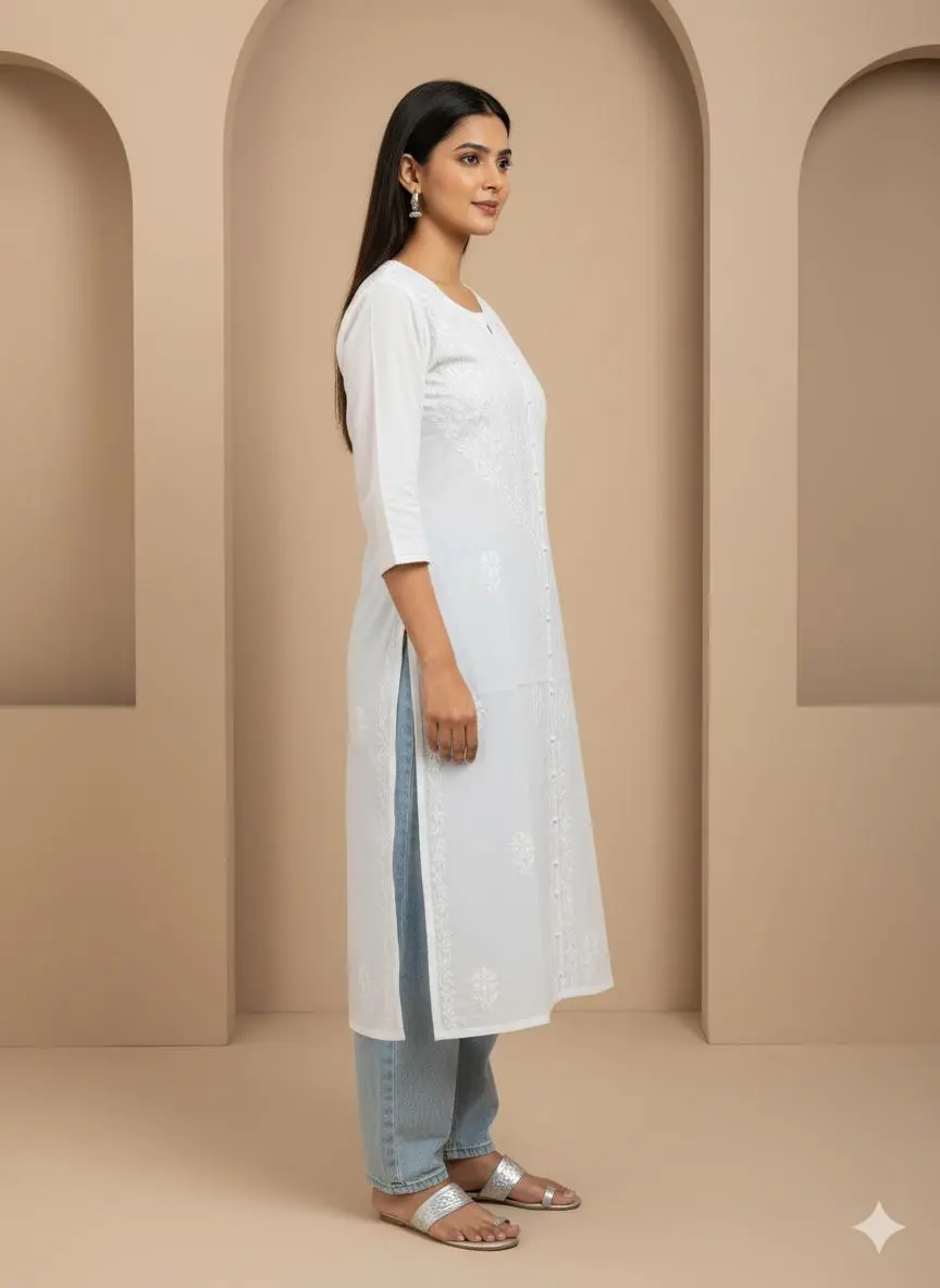 Step into timeless elegance with Elaasa’s White Cotton Authentic Chikankari Kurti — a delicate fusion of traditional craftsmanship and modern comfort. Handcrafted by skilled artisans, this kurti features intricate Chikankari embroidery that reflects the rich heritage of Lucknowi artistry. Made from soft, breathable cotton, it ensures all-day comfort, making it perfect for both casual and festive occasions. Whether paired with leggings, palazzos, or jeans, this kurti brings effortless grace to your wardrobe.